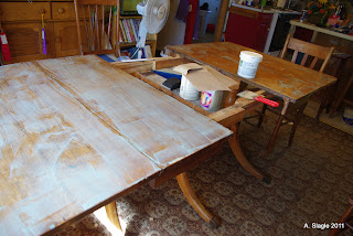 Our dining room table is showing some wear. My parents got it when they first got married. I decided it was time to give it a facelift. So I used the rest of the goop I had to remove the old varnish and polyurethane.